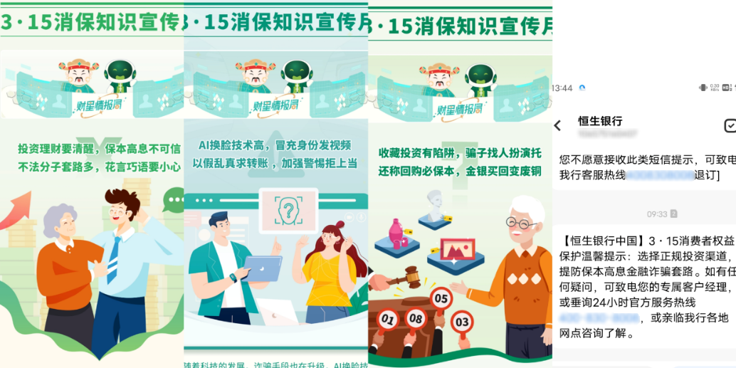 线上恒生中国积极开展形式多样的宣传,以易传播、高效率、简易懂、便保存的微信推文形式,每周推送“骗术破解卡“ “以案说险”等系列微信文。关注“一老”,即老年群体,提示老年人收藏品以及保本高息骗局;关注“一少、一新”,即青少年群体与新市民群体,加强“套路贷”的风险提示;同时解析最新AI换脸技术智能诈骗套路,通过官网、APP、微信公众号等多渠道开展宣传,全渠道普及金融教育内容。3月15日,恒生中国面向客户群体发送5万余条短信,提醒消费者提防保本高息金融诈骗套路,进一步扩大宣教的覆盖面和影响力。