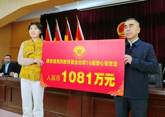 1月25日上午10点,第16届爱心敬老金发放现场,亮亮教育基金会理事长许阳阳亲手把写有“1081万元”的捐赠牌匾送到惠安县慈善总会会长手中,随后台下响起一片掌声……
