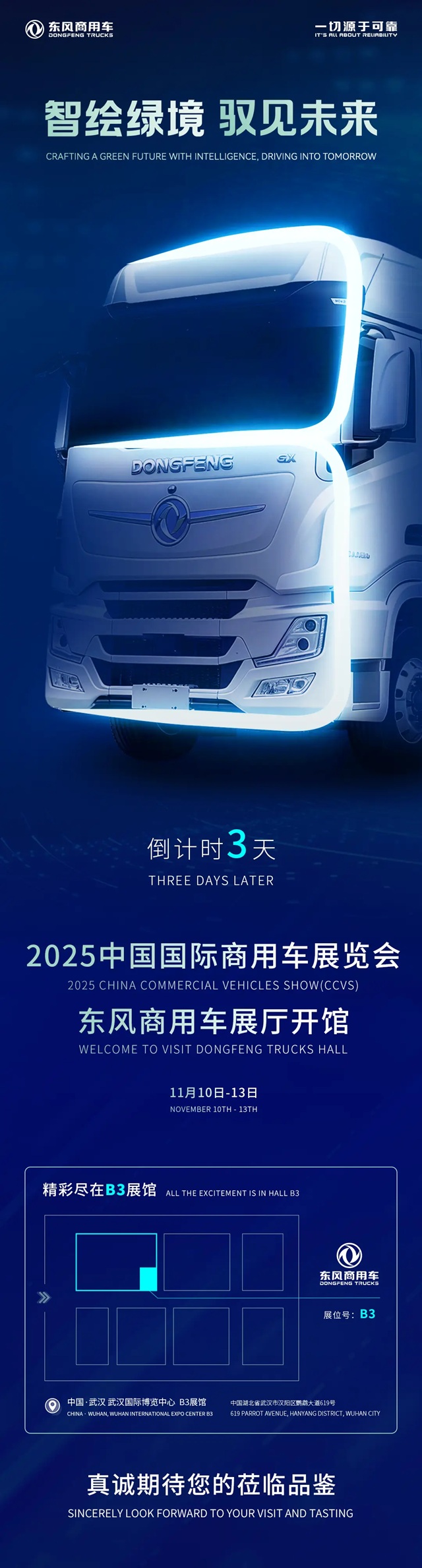 以“智”绘未来,以“绿”行天下。11月10日-13日,东风商用车诚邀您亲临武汉国际博览中心东风商用车展台,共鉴“智绘绿境 驭见未来”的绿色盛宴,见证绿色智慧科技的无限可能。