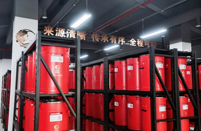 新仓内,一排排红色陈化桶整齐排列,每个桶身都配有带二维码的”身份证”,标注原料名称、代码、仓库位置等信息,实现全程可追溯。24小时智能监控系统实时监测温湿度,科技与传统完美融合,确保每一片大红袍”来源清晰、传承有序、全程可控”,为优质陈化保驾护航。