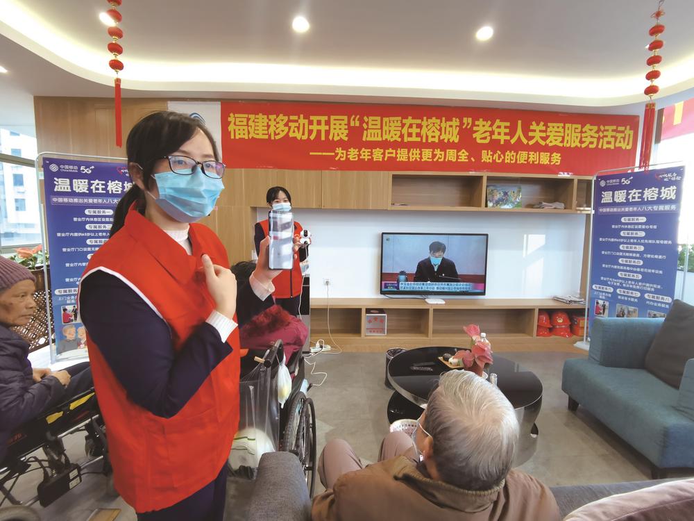 昨日,在福州台江区茶亭街道的中和慧心养老院内,10余位老人正乐融融地欣赏着移动互联网电视上的戏曲节目,京剧、莆仙戏等经典唱段让老人意犹未尽。在他们身边,是福建移动的青年志愿者们,当天上午,志愿者们不仅为老人们送来了口罩、牛奶等冬日用品,还帮老人们量血压、修改手机套餐,同时,手把手地教会老人们如何使用微信视频聊天等手机基础操作。贴心的服务,在敬老院内汇聚成了一股冬日暖流。