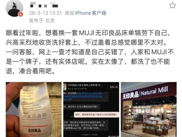春节临近,准备买年货的要擦亮眼睛了。近日,社交媒体上有消费者反映,本意网购“MUJI无印良品”商品,收货后却发现买到的是“无印良品 Natural Mill”。类似这样因品牌名称、视觉风格相近而产生的误购情况,引发了公众对品牌识别与企业经营边界的关注。